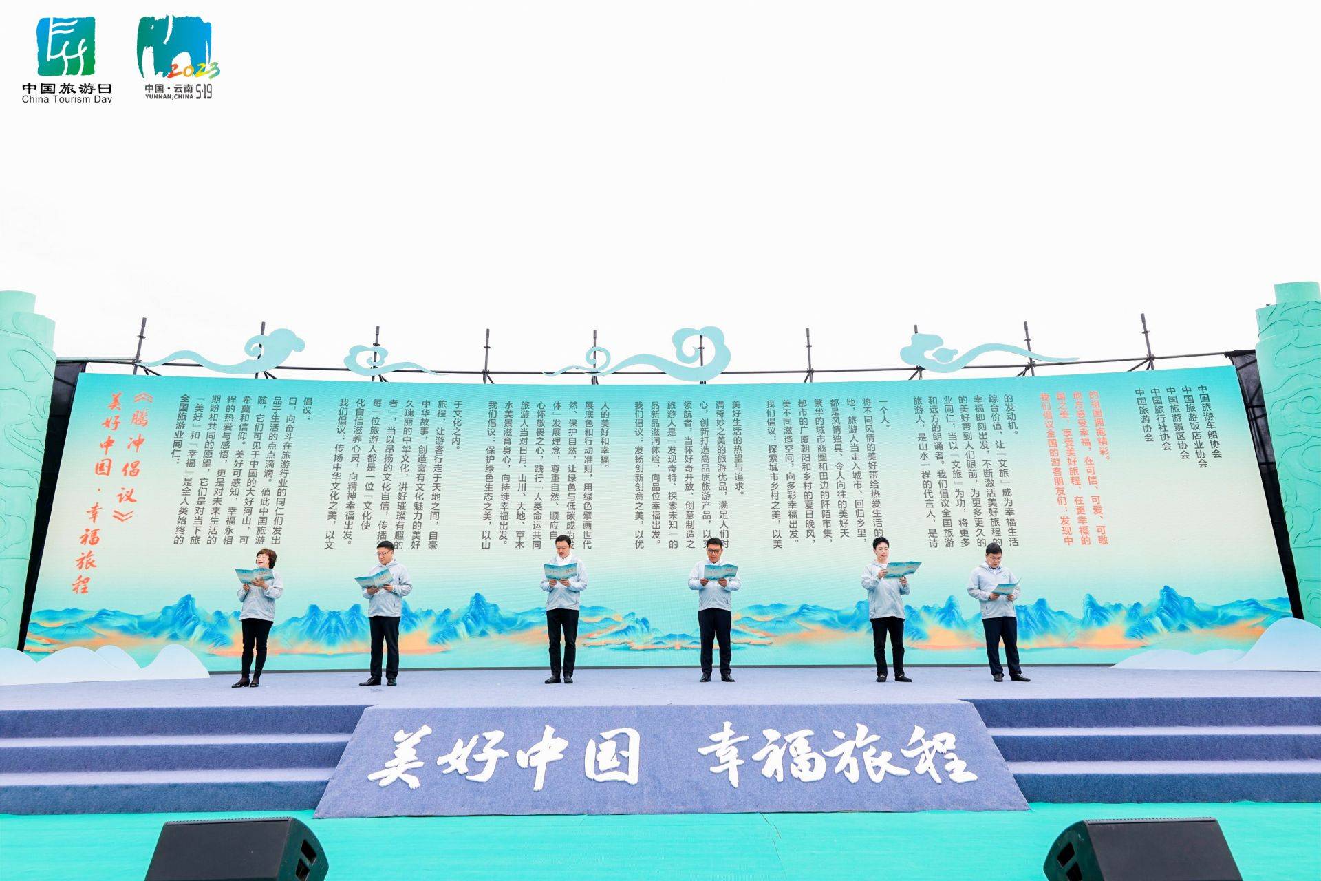 5月19日,“美好中国 幸福旅程”2023年“5·19中国旅游日”主会场活动暨启动仪式在云南保山腾冲和顺古镇举办。活动现场,中国旅游协会、中国旅行社协会、中国旅游景区协会、中国旅游饭店业协会、中国旅游车船协会联合发布美好中国·幸福旅程《腾冲倡议》。(倡议如下:)
