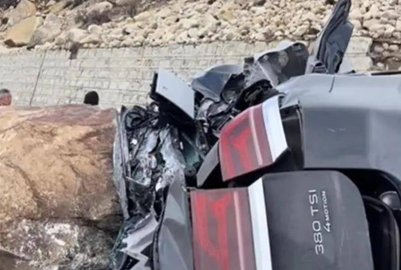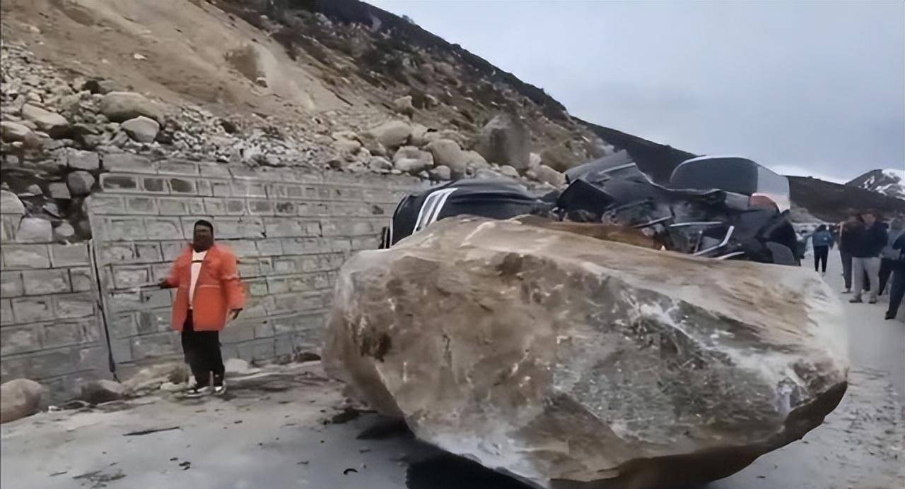 话说,在318川藏线姊妹湖段,有一块巨石从山上滚落,砸中一辆停靠在路边的小车,小轿车侧翻,一侧车身,已经被砸烂。
