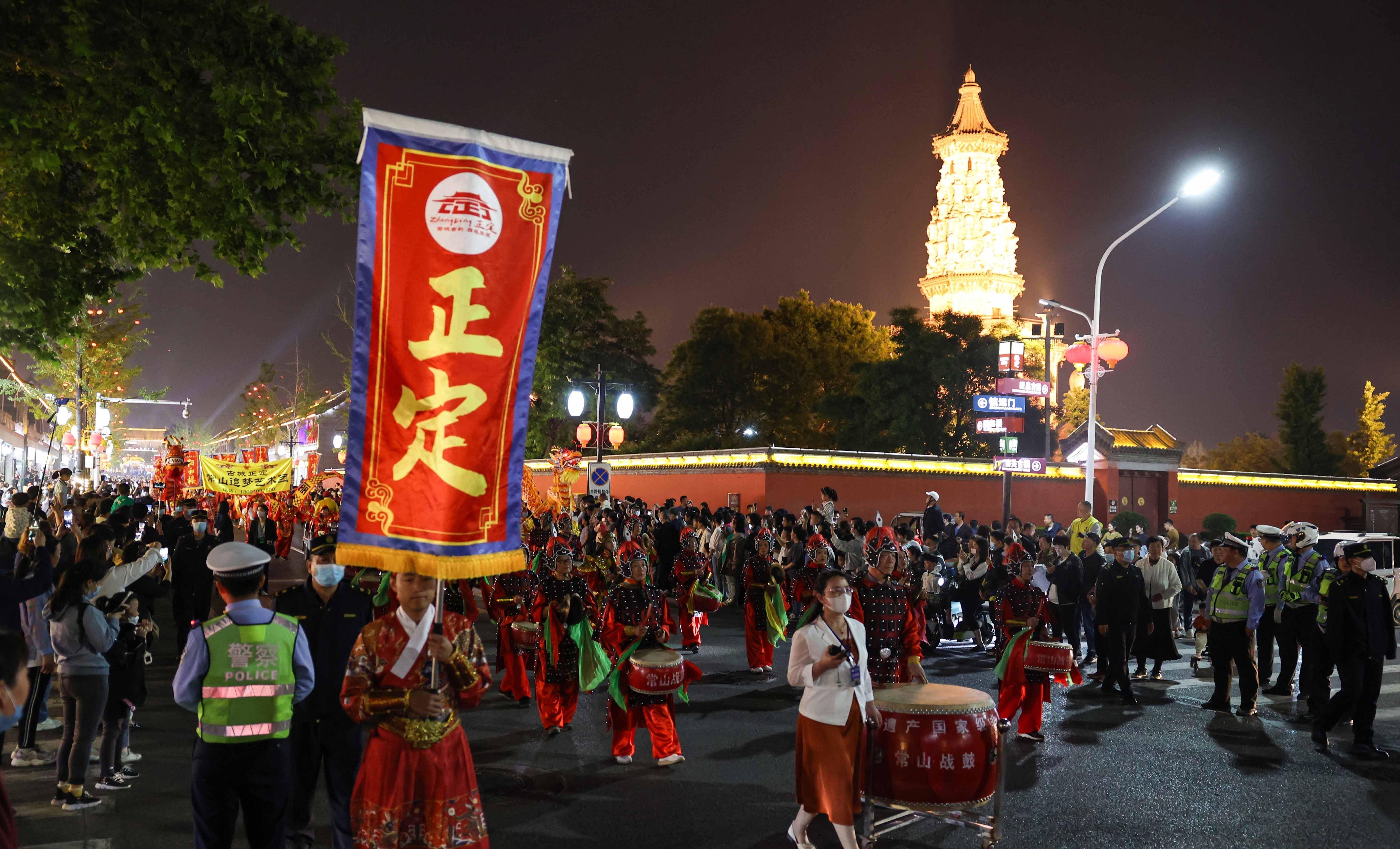 夜巡游队伍行驶至正定古城南城门前。