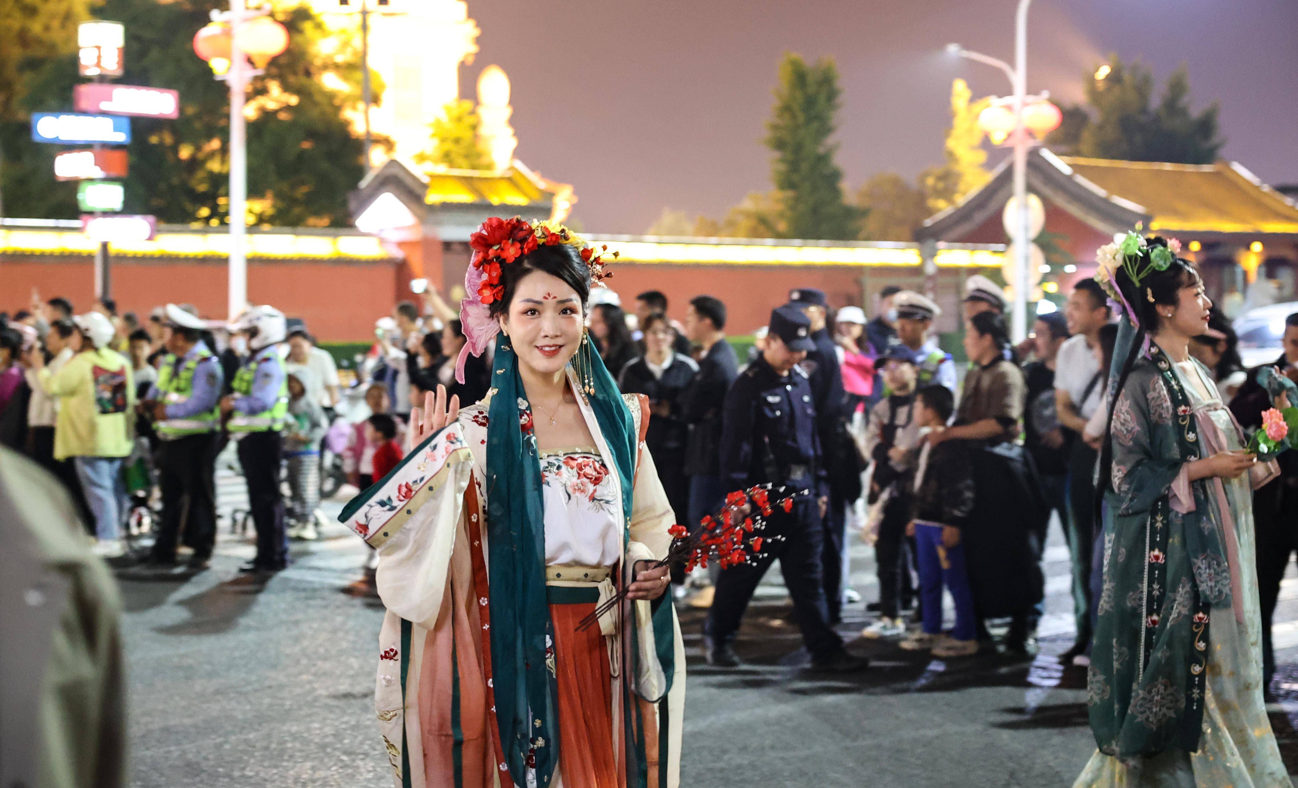 这是夜巡游队伍中的最为亮眼的一辆花车,一名着古装的女子在车上翩翩起舞,赢得众多观众一阵欢呼。