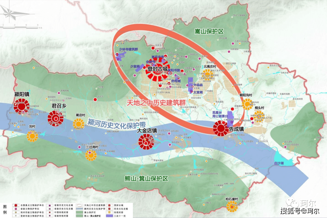 “嵩箕相望,颖水田园”:着重突出生态、文化、农业保护要素,包括嵩山、箕山等山林生态保育区和历史文化资源形成的生态文化保护区;颍河水系和沿岸历史文化资源构成的生态文化保护带;以颍河两岸相对高质量农田为主的基本农田保护区。