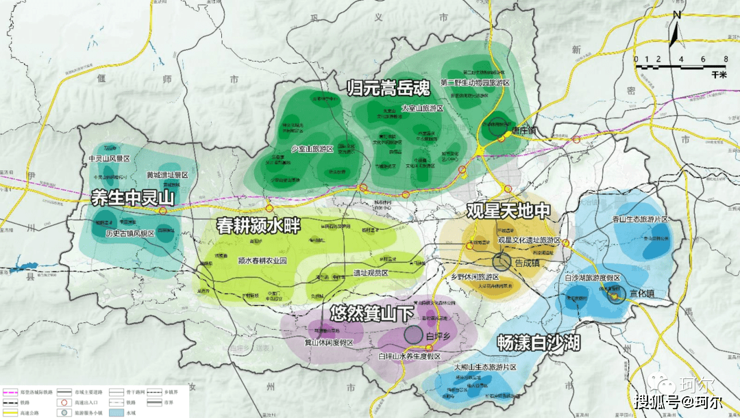 六大主题旅游板块:归元嵩岳魂、观星天地中、畅漾白沙湖、悠然箕山下、春耕颖水畔、养生中灵山。