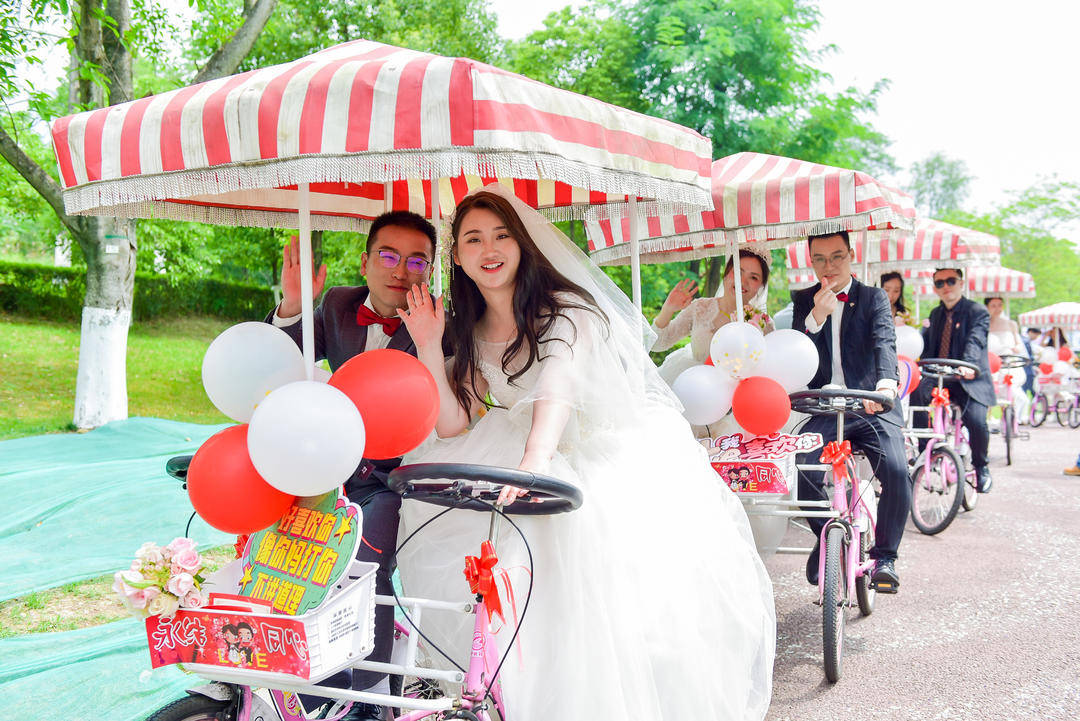 5月20日,16对新人在成都高新区桂溪生态公园婚姻登记处参加了由成都高新区社区治理和社会保障局主办、天府绿道集团承办的集体婚礼。有意思的是,新人们以骑行的方式为即将举行的成都大运会助威。