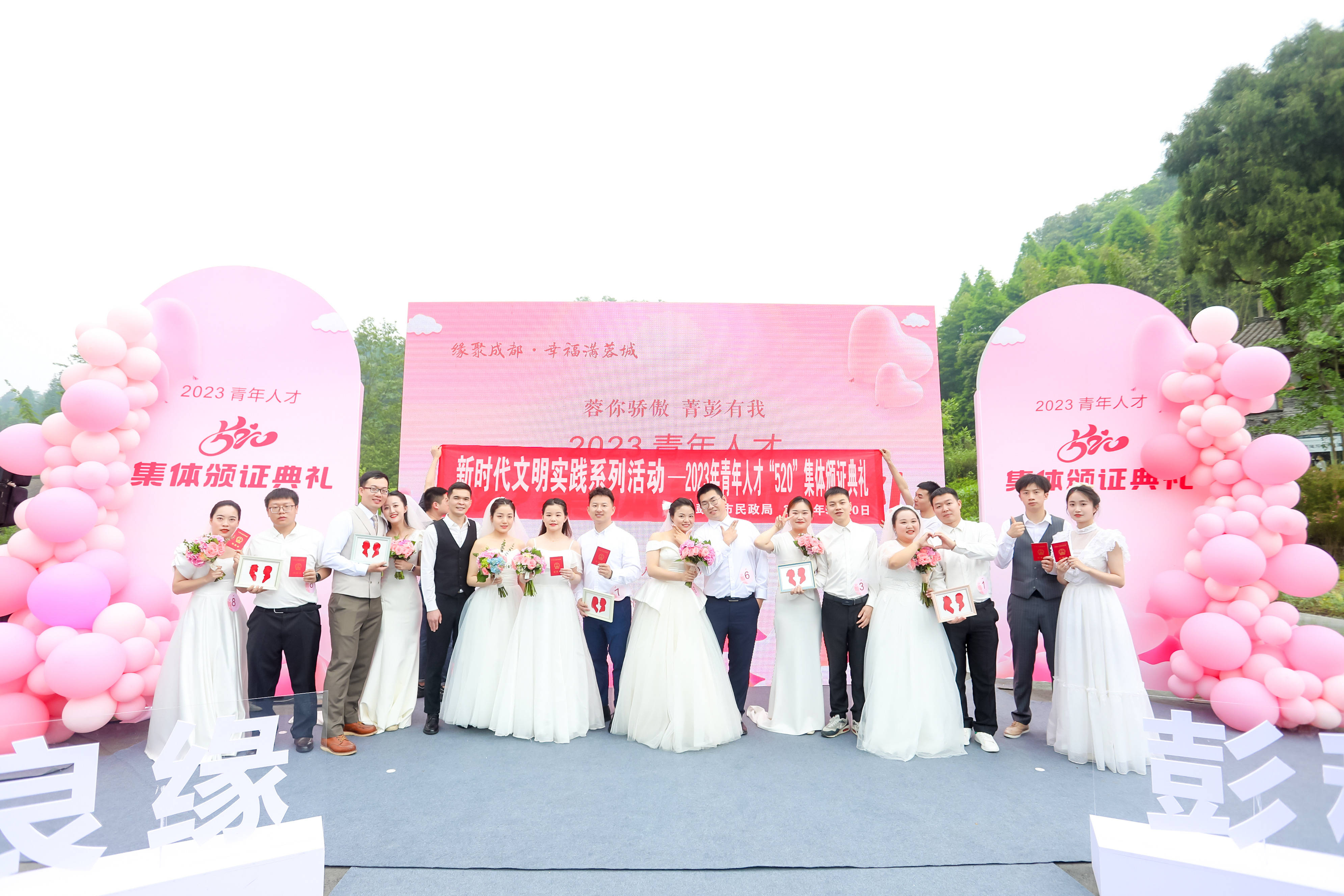 初夏的彭州,鹿野花塔漫山绣球、柒村花花世界遍野鲜花,与浪漫的520撞了个满怀。由彭州市委人才办、彭州市民政局联合主办,桂花镇人民政府承办的“缘聚成都·幸福满蓉城”——“金玉良缘彭程万里”2023青年人才“520”集体颁证典礼在四川省彭州市桂花镇龙门山·柒村举行,这是彭州市推进婚俗改革、倡导婚事新办简办的一次重要实践。