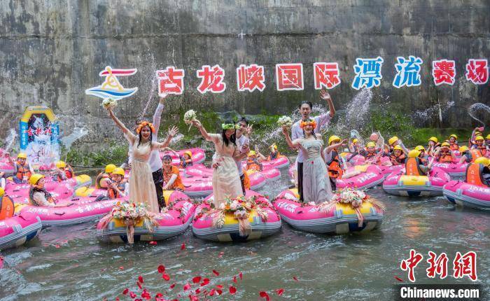 被花束和花球环绕的粉红色漂流艇,成为了漂流河道里的“婚车”,一路急速前行。尤其是在古龙峡“神龙摆尾”河段,此处落差达17米,相当于6层楼的垂直高度,转角达180度,类似“U型”大转弯。一时之间,欢呼声与尖叫声在峡谷间延绵流转。