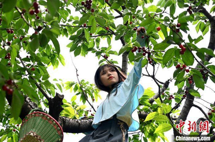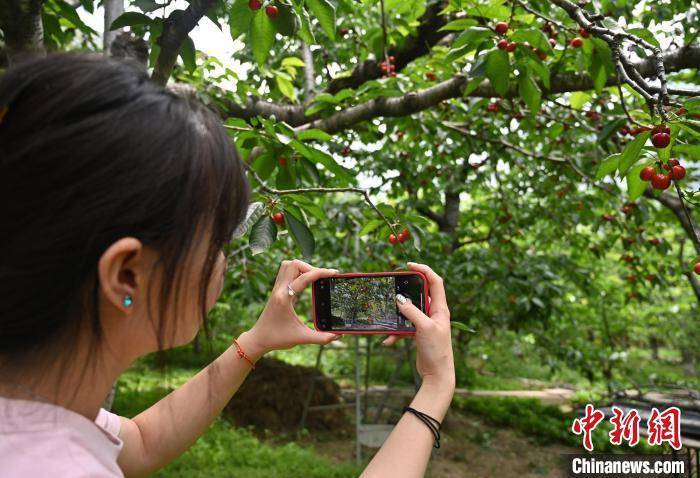中新网阿坝5月20日电 (单鹏 安源 杨予頔)2023汶川甜樱桃采摘节20日在四川阿坝州汶川县绵虒镇开幕。许多外地游客驱车前来,体验属于汶川的“甜蜜”。