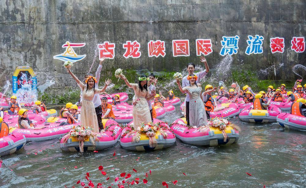 据了解,漂流婚礼在古龙峡景区已不是第一次。现在越来越多年轻人摈弃复杂繁琐的传统婚礼,选择走进自然挑战更新奇、有趣的婚礼形式。