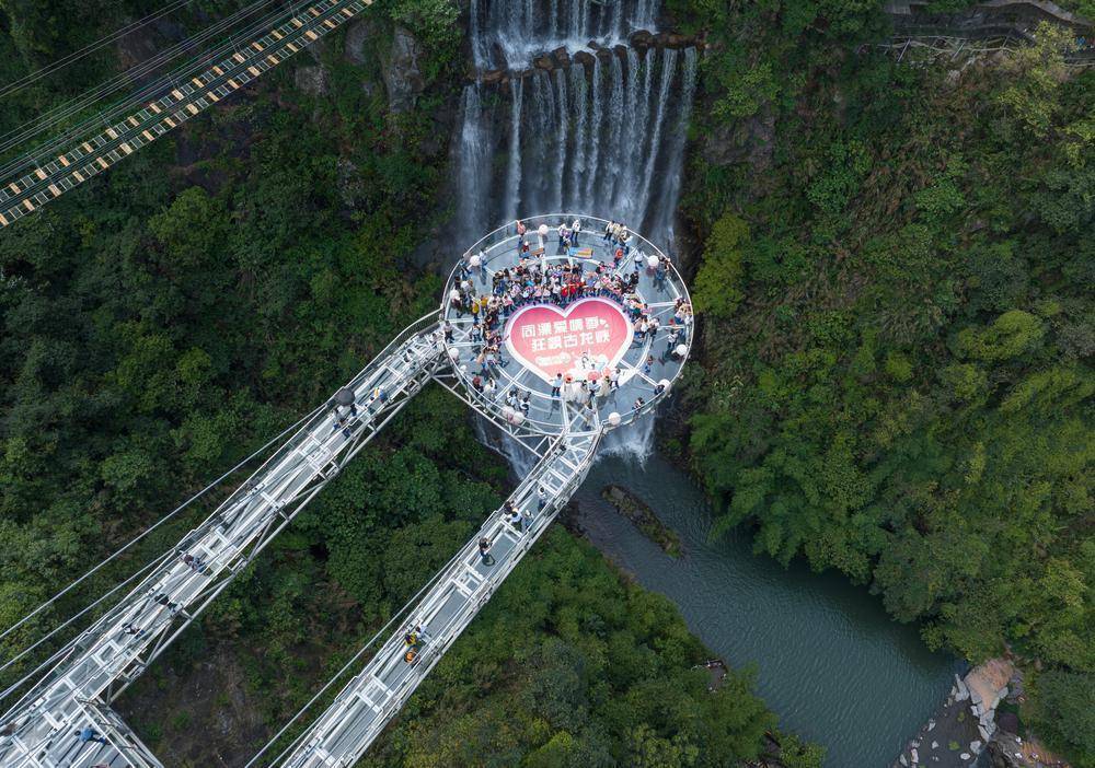 恋人们除了体验别样的婚礼漂流,还携手走过了1314米长的云天玻霸,寓意着爱情一生一世长长久久。在象征团圆和美的玻霸平台上深情拥吻,共同许下爱的誓言。