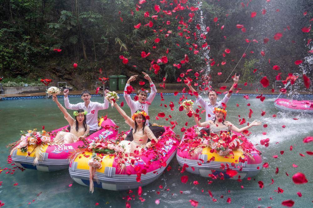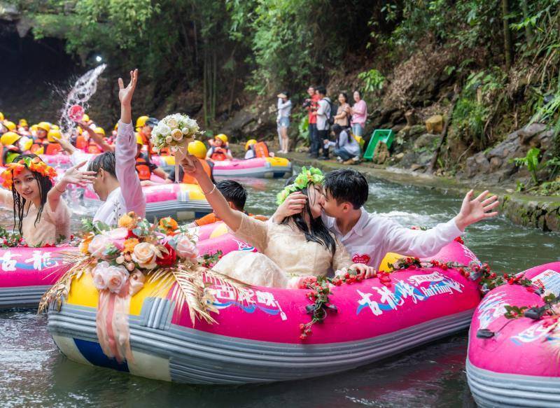 身着洁白婚纱的新娘和一身帅气礼服的新郎,携手登上粉色的“花艇”冲入急流,随后情侣们的粉红漂流艇鱼贯而出,共同在激流的跌宕起伏间进行了一场狂飙之旅。风雨同舟、携手并进的情侣们将一处处激流回旋、一道道极限落差抛在身后,收获了满满的喜悦和欢乐。