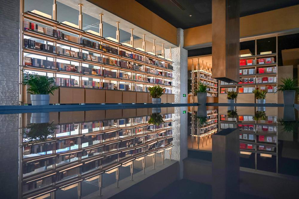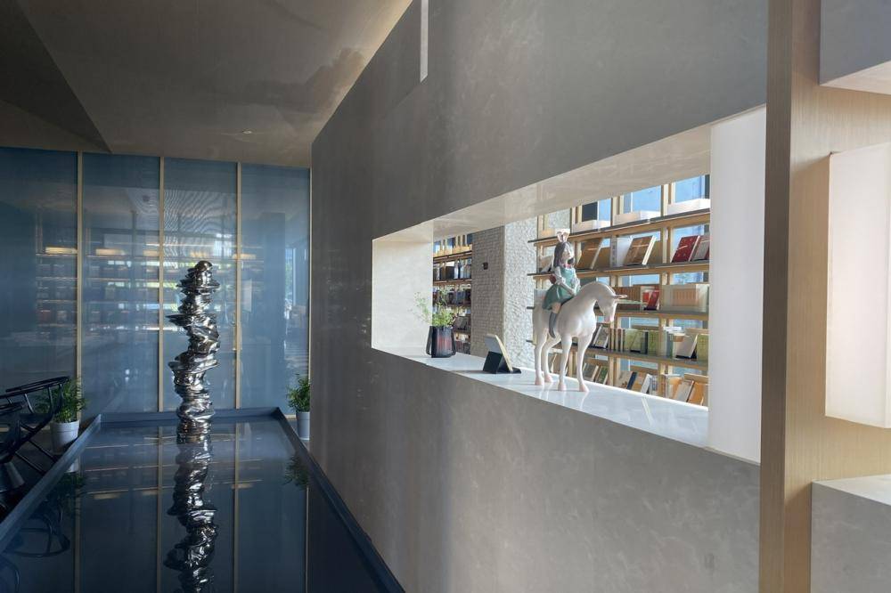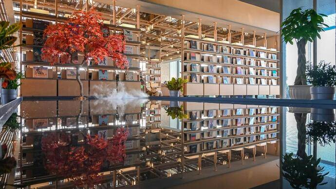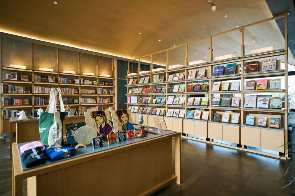 这家朵云书院的面积超过1000平方米,几乎占据了酒店整个一层,还有舒适的二楼露天平台。书店设计灵感来自苏州园林,以“新·游园惊梦”为主题,店内充满江南文化元素。书店中的空间自然形成透景、框景,同时大量使用榫卯结构书架墙、宣纸墙面等非遗元素,有1.6万册图书和1000款文创好物,让读者在书海中移步换景。图书类别上不仅涵盖传统的文学、艺术、经管、人文社科、童书等,还增加了符合酒店休闲人群的生活类别如咖啡、红酒、美食等题材图书,并设立四个特色主题书架:云上书榜、国潮听韵、凝望姑苏、女性视角。