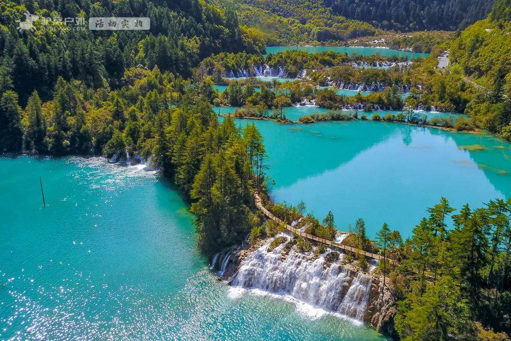 九寨沟掩倒映在苍翠欲滴的浓阴之中,五色的海子,流水梳理着翠绿的树枝与水草,银帘般的瀑布,抒发四季中最为九寨沟恣意的激情。