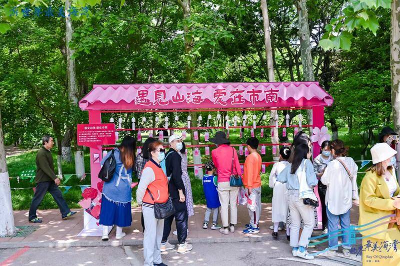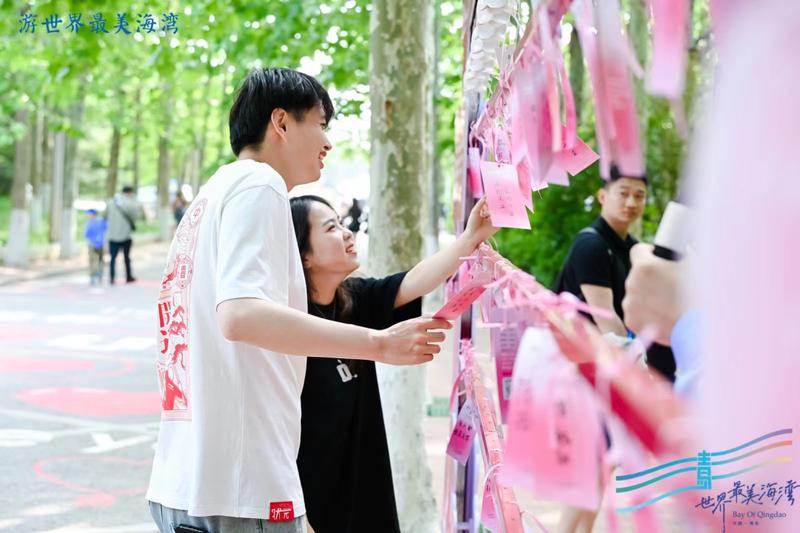 冒着泡泡的粉红爱心、双向奔赴的九步共白首跳格子、充满爱意的表白文案……位于市南区太平角公园的“爱情路”一亮相就成为网红打卡地。此次艺术季期间,“爱情路”上新“风铃爱情角”。粉色的“风铃爱情角”挂满市民游客手写的小卡片,有的写满“爱的告白”,有的表达“爱情宣言”。微风吹过,一排排粉色卡片随风舞动,更添浪漫气息。