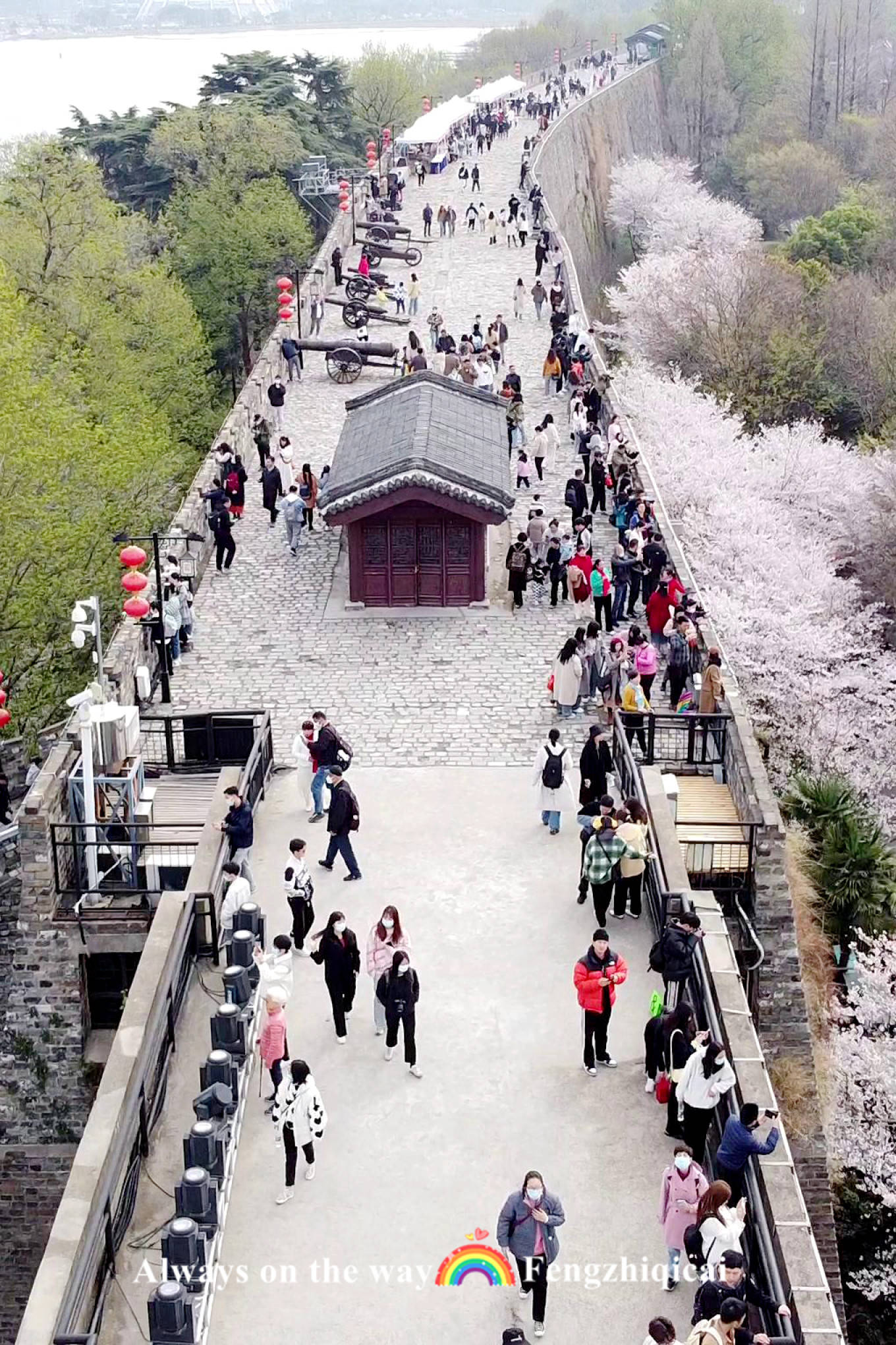 雄伟城墙下,玄武湖波光潋滟,樱花把虎踞龙盘的金陵城直接勾勒而出。