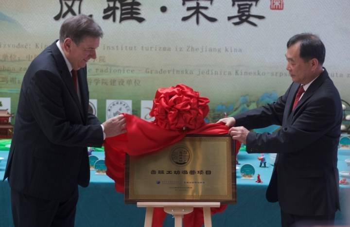 活动当天,“鲁班工坊·中塞旅游学院”正式落地贝尔格莱德。浙江旅游职业学院作为项目牵头单位,携贝尔格莱德应用技术学院、杭州饮服集团和塞尔维亚泷鼎昇酒店三家共建单位,共同为鲁班工坊揭幕。