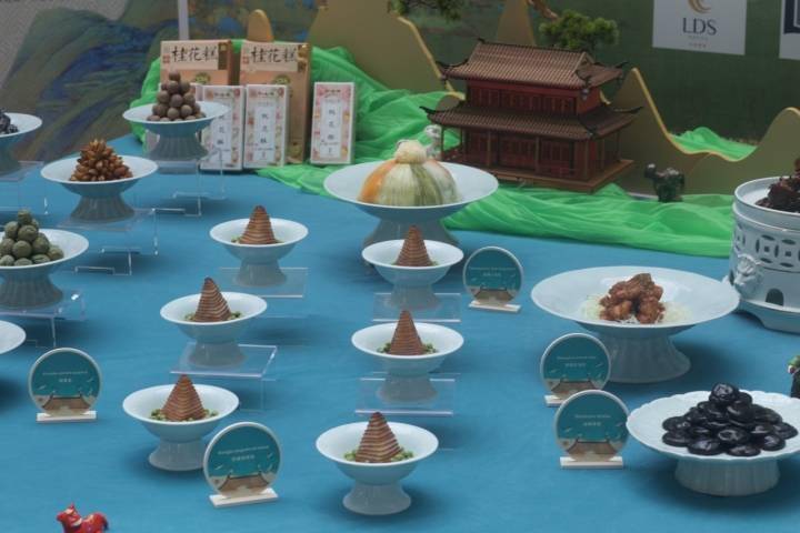 “品味杭州,千年宋韵,是我们设计这次美食文化展的出发点。所以我们在台面设计上,以西湖美景为背景,专门设计了苏东坡面塑形象。在冷碟、热菜和点心等设计上,展示了武林鱼丸、叫花鸡、钱塘八宝菜、定胜糕等宋菜宋点,还有莼菜珍珠汤、油焖香菇、黄精炖猪蹄等浙江‘百县千碗’菜肴,以及香蕉鱼夹、酒酿红油虾等国宴菜,以此展示中国传统饮食文化和烹饪技艺。”中国金晓阳厨艺传承大师工作室负责人、厨艺学院院长金晓阳介绍。