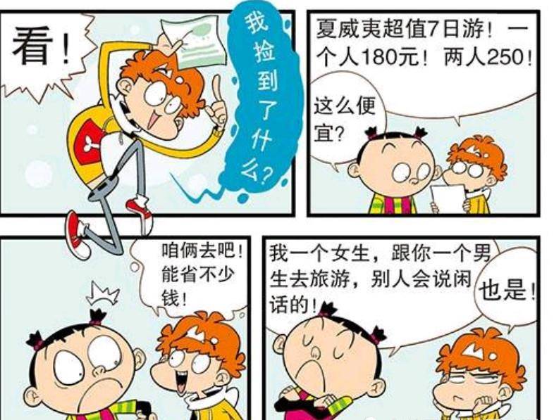 阿衰意外的捡到了一张旅游宣传单,夏威夷7日游,一人180,两人250,很便宜有莫有!这不,阿衰就邀请大脸妹和她一起双人游,毕竟一个人去旅游可是很孤单的!可大脸妹碍于面子,怕别人误会自己和阿衰是情侣,不想去,阿衰立马就想到了一条