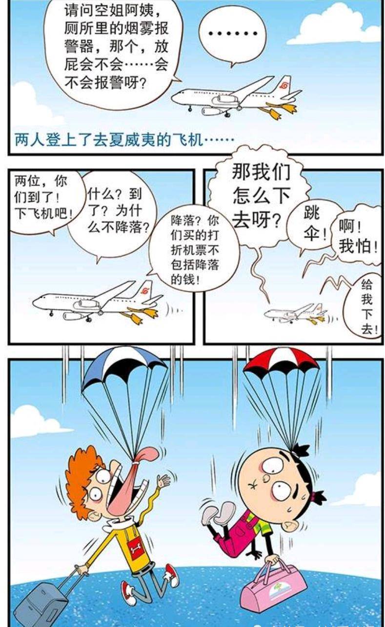 怎么样,阿衰从来不会让我们失望!是不是聪明绝顶,就这样,他们踏上了夏威夷之旅!才上飞机没一会,乘务员就让他们下飞机了,这时两人懵逼了,飞机到站不是会停吗?怎么还在天上,这时,空姐告诉他们,他们买的打折机票不包括降落钱,我去,还有这操作,不出意料,他们被赶下了飞机!