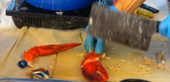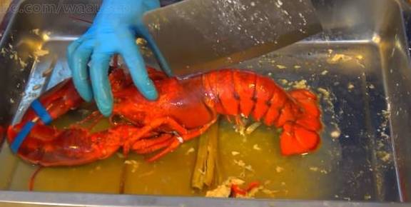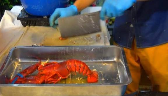 再把它给切成小块,方便我们吃的时候省点事。看看这只龙虾钳子多大啊,真是比鸡腿还要肥呢!