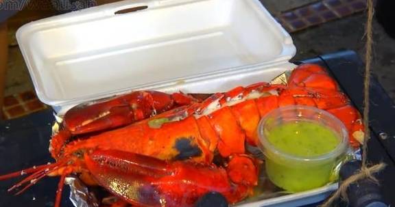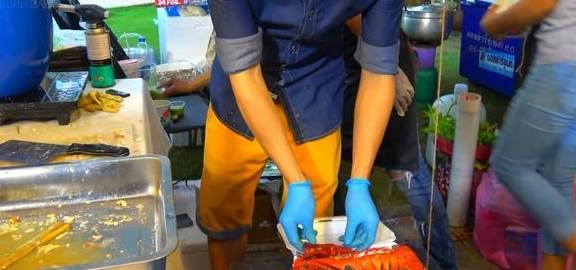 做好之后,他把这只超大的龙虾放到打包盒里,然后拿给我们。