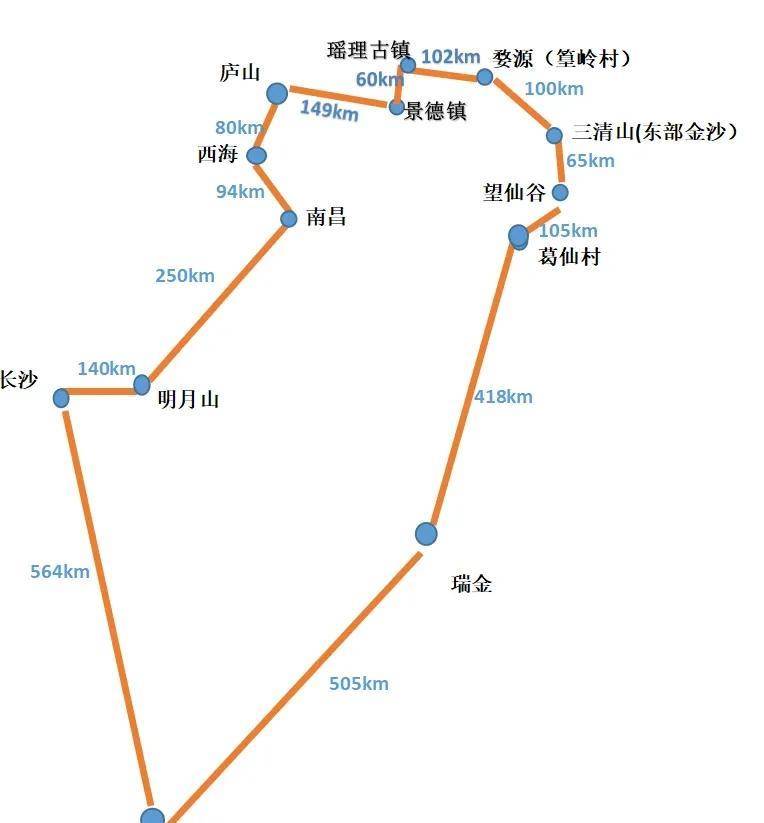 计划旅游路线为:广州——瑞金——葛仙村——望仙谷——三清山——婺源——瑶理古镇——景德镇——庐山——西海——南昌——明月山——长沙——广州。全程约2700公里。