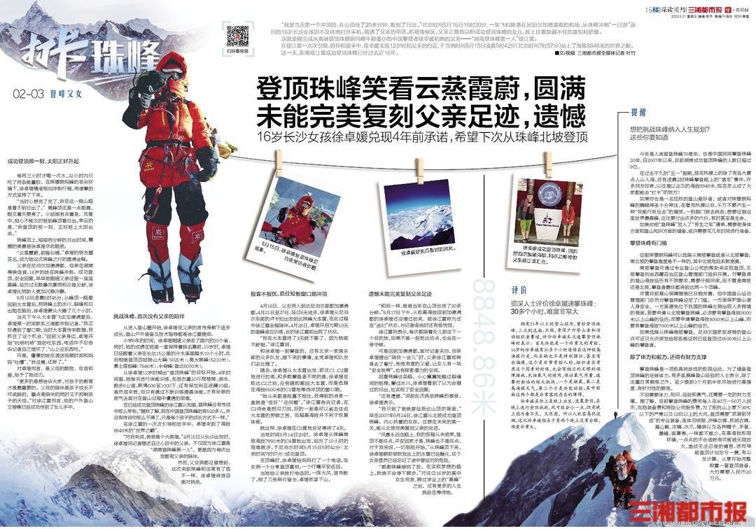 12岁喊出“要登顶珠峰”,经过4年的准备,在尼泊尔当地时间5月15日凌晨5时42分(北京时间7时57分),长沙16岁女孩徐卓媛终于实现梦想,站上了她的父亲——“湖南登珠峰第一人”徐江雷曾经抵达的海拔8848米,成为从南坡登顶珠峰年龄最小的中国攀登者。