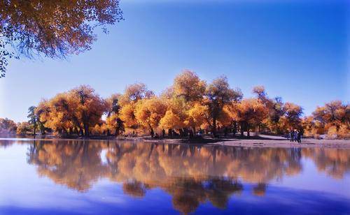 看胡杨林,不一定需要千里迢迢跑到新疆去,在黑河也能看到最原始自然的胡杨林景色。在额齐纳河畔生长的胡杨,已经长了不知道几百上千年,它们千姿百态,在靠近水源的一面倾斜,行走在胡杨林里,眼前都是舞动的金黄色,加上天高云淡,实在是让人感悟生命的本源。