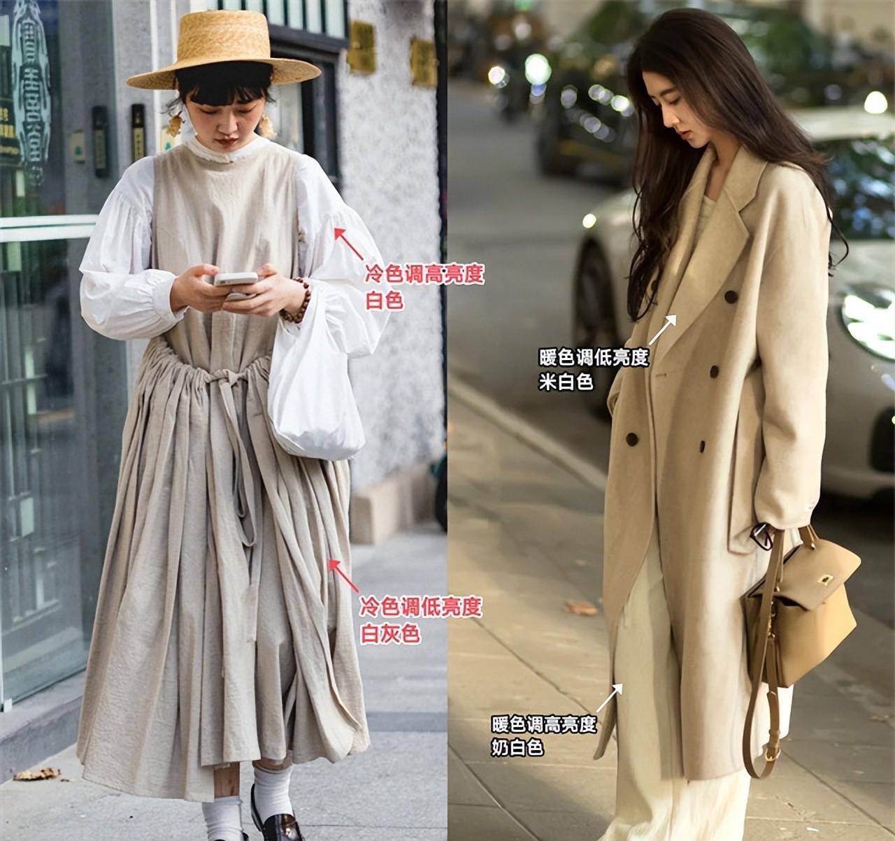 质感可以来自于整体搭配的高低,高级的服装永远比低级的服装高级。于是就有了白色搭配冷暖色调相同,但饱和度和明度不同的叠法。