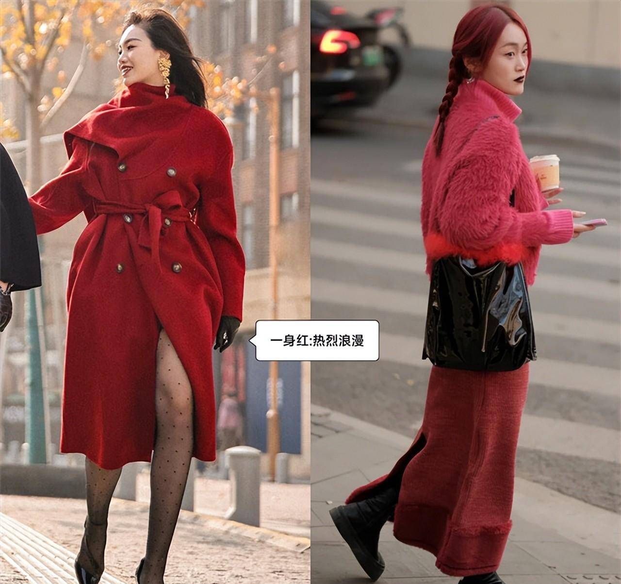 在上海,喜欢穿红色衣服的女孩,往往身材高挑、骨骼粗壮,或者微胖壮实。只有这么大的体型,才能驾驭大量红色的侵略性和视觉冲击力。红色浪漫热情的属性,也让红色的穿搭受到了很多喜欢华丽复古或者新中式风格的姐妹们的喜爱。