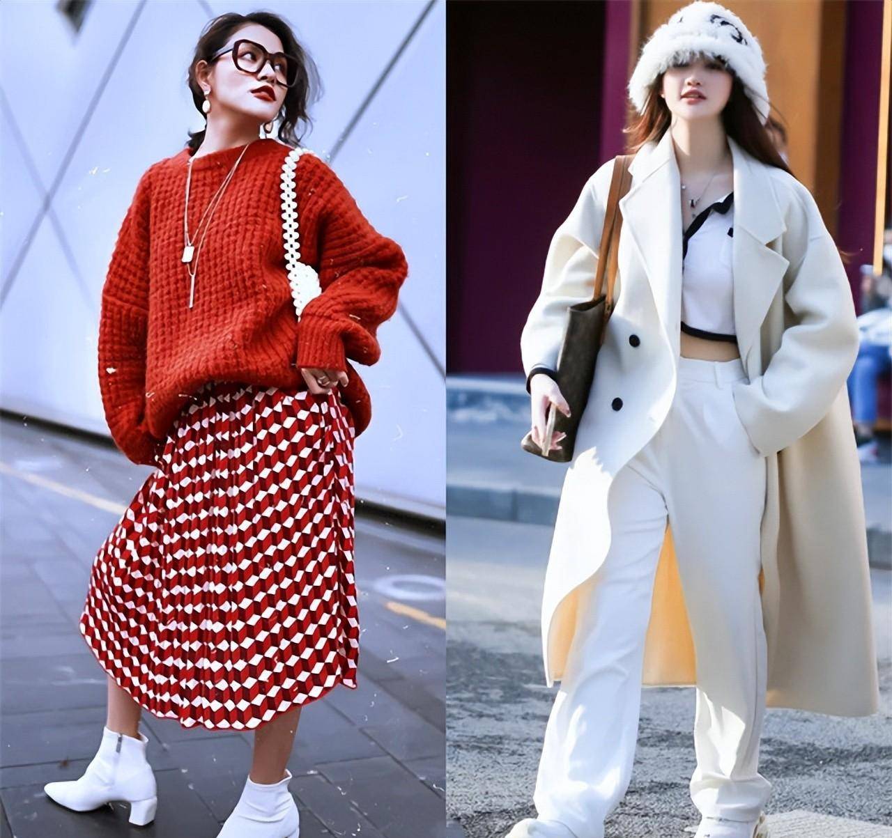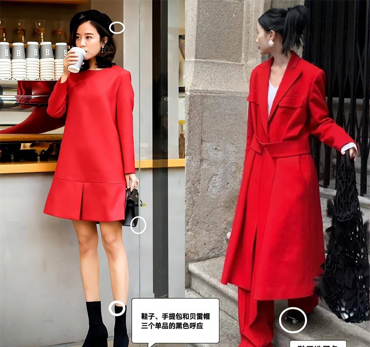 左边的红色A字裙利用贝雷帽、手提包和短靴三个位置来呼应三个位置;右边的红色外套+同色阔腿裤,中和了黑色平头鞋。普通人现在可以穿红色了!