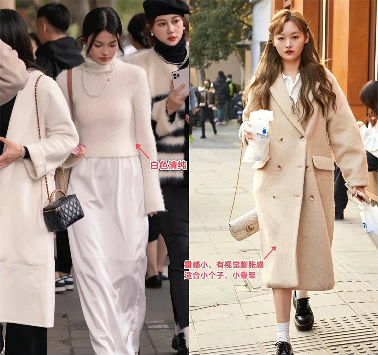 一件米色的羊羔毛大衣,厚实的针织衫+毛绒饰边的大衣,能让一身白色的穿搭贵气十足。一定要选择厚实的毛绒,最好和身体的关节处有明显的粗细对比,这样看起来还是比较瘦的!