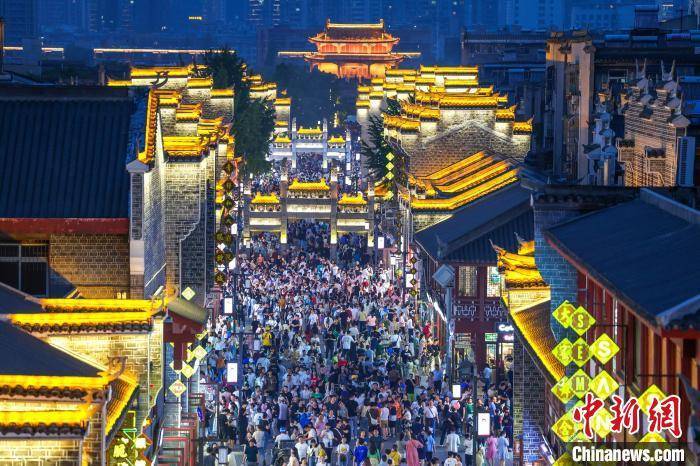 游客打卡襄阳北街感受流光溢彩的古城夜景。 杨东 摄