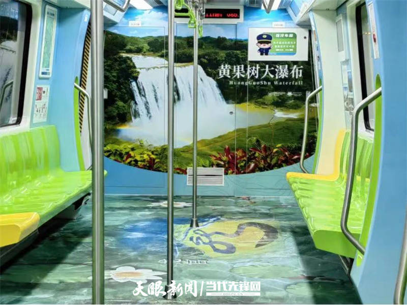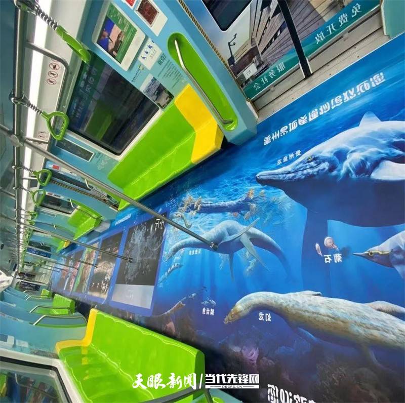 据了解,此次省地质博物馆推出的“跨界融合”号地铁列车,收集和利用了我省各有关部门大量工作成效实景、创意绘画、优美风景照片等内容,将车厢包装营造出一个个不同主题的沉浸式乘车环境,让列车成为一座展示贵州自然风光、文化风貌等资源的“天然博物馆”。