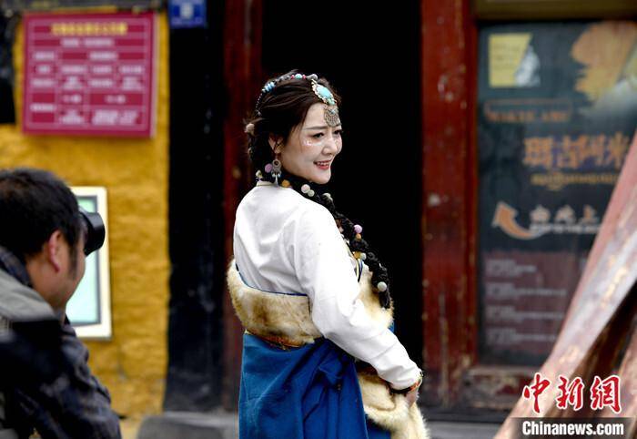 来自北京的游客孙璐,刚刚换上藏装,造型师正在给她调整头饰。她告诉记者,已经在西藏游玩了九天,去了很多地方,了解一些西藏的文化与习俗,穿着藏装在八廓街拍摄写真,一方面可以亲身感受藏族服饰的魅力,另一方面可为此次旅行留个纪念。孙璐表示,进藏之前对高原反应有点顾虑,但旅途中,没有感觉到明显症状,“只要心态调整好,保证足够睡眠,大家就不用过于担心。”
