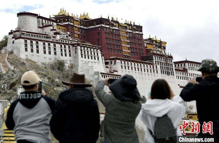 5月19日,游客在西藏拉萨布达拉宫观景台拍照留念。5月的拉萨初夏,草木渐茂、绿树成荫,雨量充沛、湿度适宜,日光充盈却少了一丝燥热,成为了众多游客选择进藏的最佳时节。 中新社记者 李林 摄