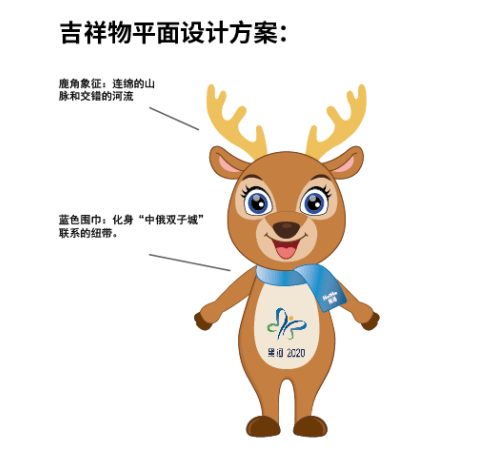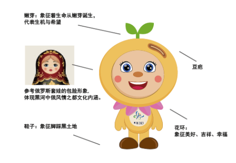 其中“呦呦”——鹿宝宝,语出《诗经·小雅》:“呦呦鹿鸣,食野之苹。我有嘉宾,鼓瑟吹笙。”“呦呦”这只麋鹿宝宝世代生活在黑河的大小兴安岭之中,鹿角象征着黑河连绵的山脉和交错的河流,蓝色围巾化身为黑龙江,将中俄双子城——中国黑河与俄罗斯布拉戈维申斯克紧紧相连。“逗逗”——豆宝宝:形象来源于黑河大豆。黑河是中国大豆种植面积量、总产量最高的地级市,中国每七粒大豆就有一粒来自黑河,“逗逗”自然成为了黑河的“代言人”,它外形饱满金黄,匀称标致,逗趣可爱,包脸的形象则融合俄罗斯套娃的风格,体现黑河中俄风情之都的文化内涵。