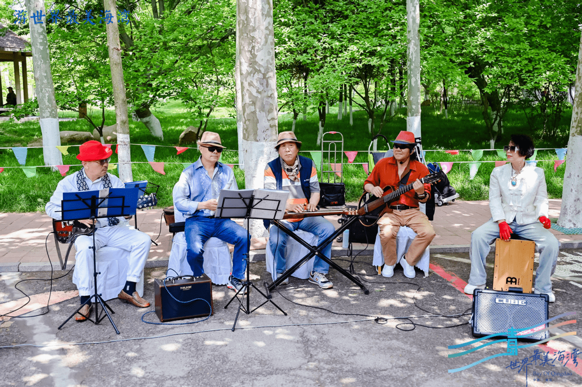 艺术岸线,惊喜无处不在,这边古筝音符刚落,那边老树根乐队已经温情开唱。这支老年电声乐队,名字取得饶有趣味:像树根一样盘根错节,但是也能发出新枝芽,是一种活力,一种生命力。和演奏古筝的学生不同,丰富的人生阅历让“老树根”们的音乐多了些历尽沧桑、归来内心依旧澄澈的味道,“竹杖芒鞋轻胜马,谁怕?”这就是艺术的力量吧,在这一场充满了岁月厚重感的快闪中,游客们静下心来,聆听电声,享受艺术,亦启迪生活。