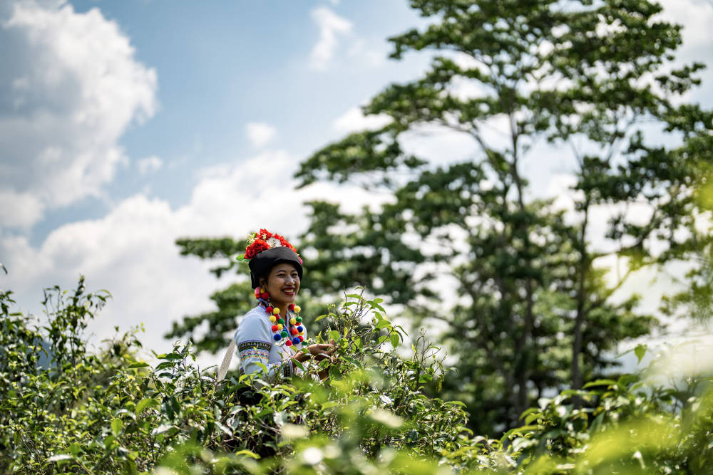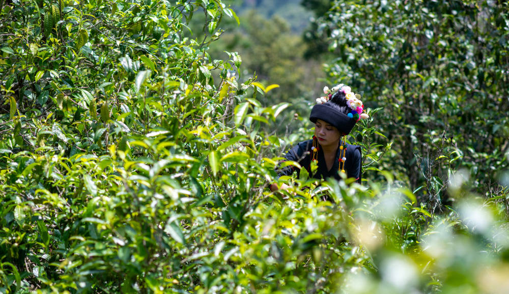 这是2023年5月17日,中国云南省勐海县布朗山布朗族乡老曼峨寨的茶农在采茶。新华社记者 江文耀 摄