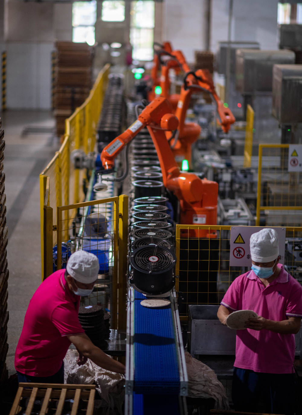 这是2023年5月18日,中国云南省勐海县勐海茶厂的工人在自动机械臂的协助下分拣包装普洱茶饼。新华社记者 江文耀 摄