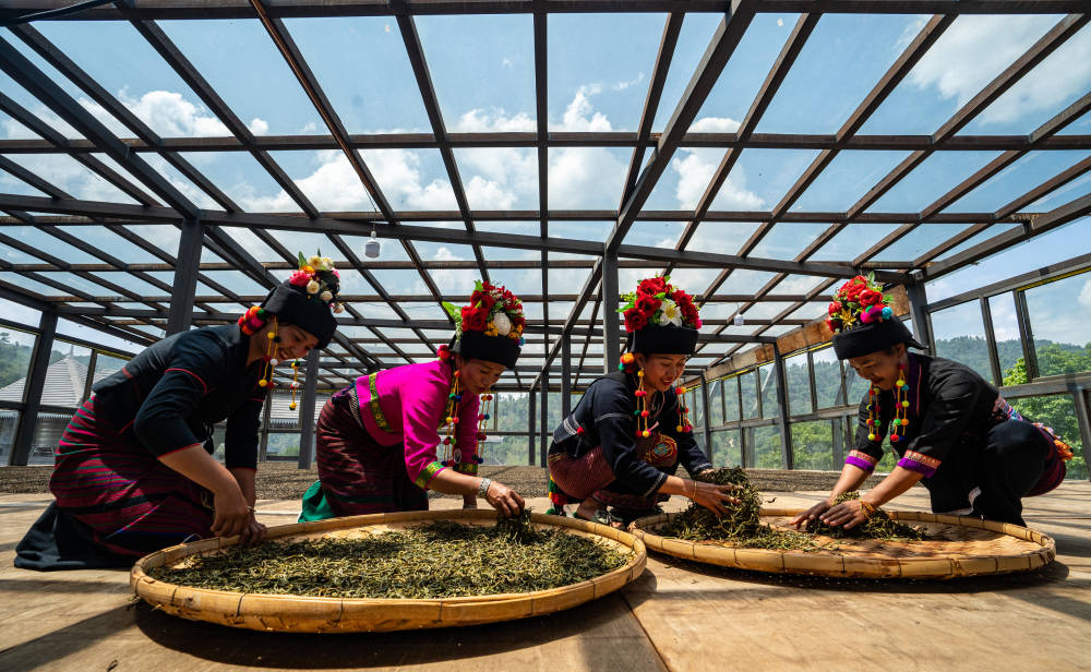 这是2023年5月17日,中国云南省勐海县布朗山布朗族乡的茶农在晾晒茶叶。新华社记者 江文耀 摄