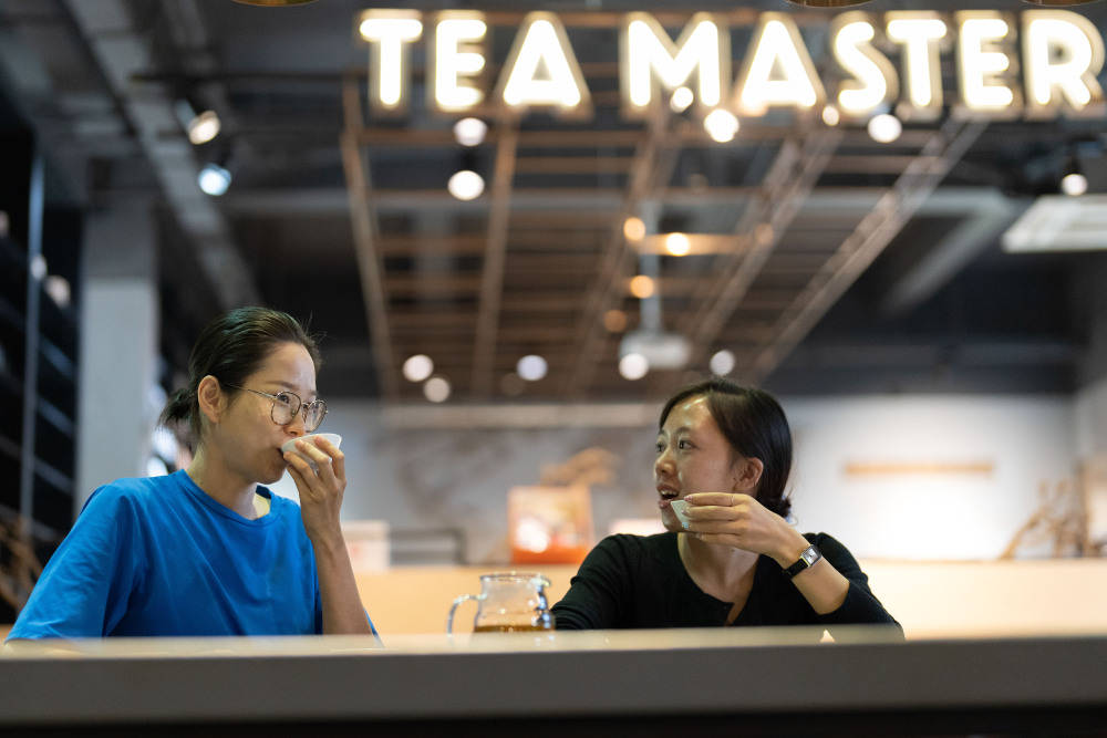 这是2023年5月18日,两名茶客在中国云南省勐海县一处茶馆品尝普洱茶。新华社记者 李木子 摄