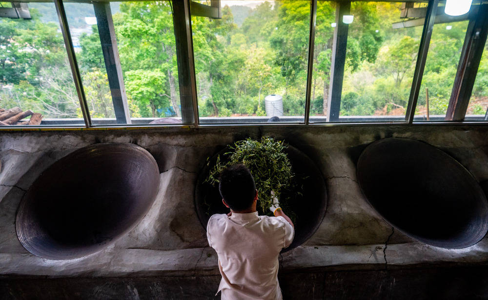 这是2023年5月17日,中国云南省勐海县布朗山布朗族乡的茶农在炒茶。新华社记者 江文耀 摄