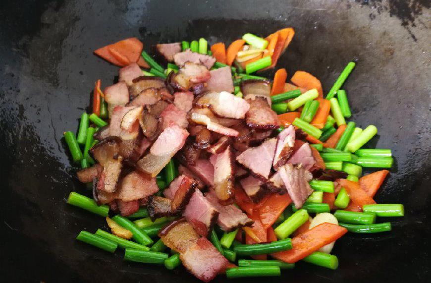 4、炒出油脂后将腊肉盛出来备用,将油留在锅里。