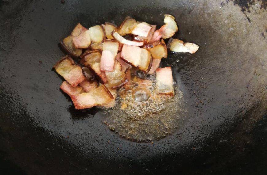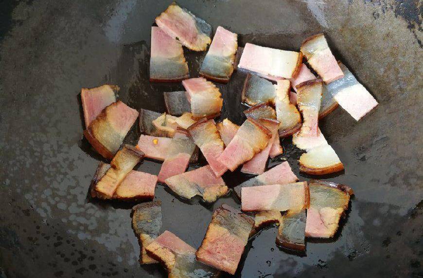 3、锅中放少许油润锅,放入腊肉小火煸炒。