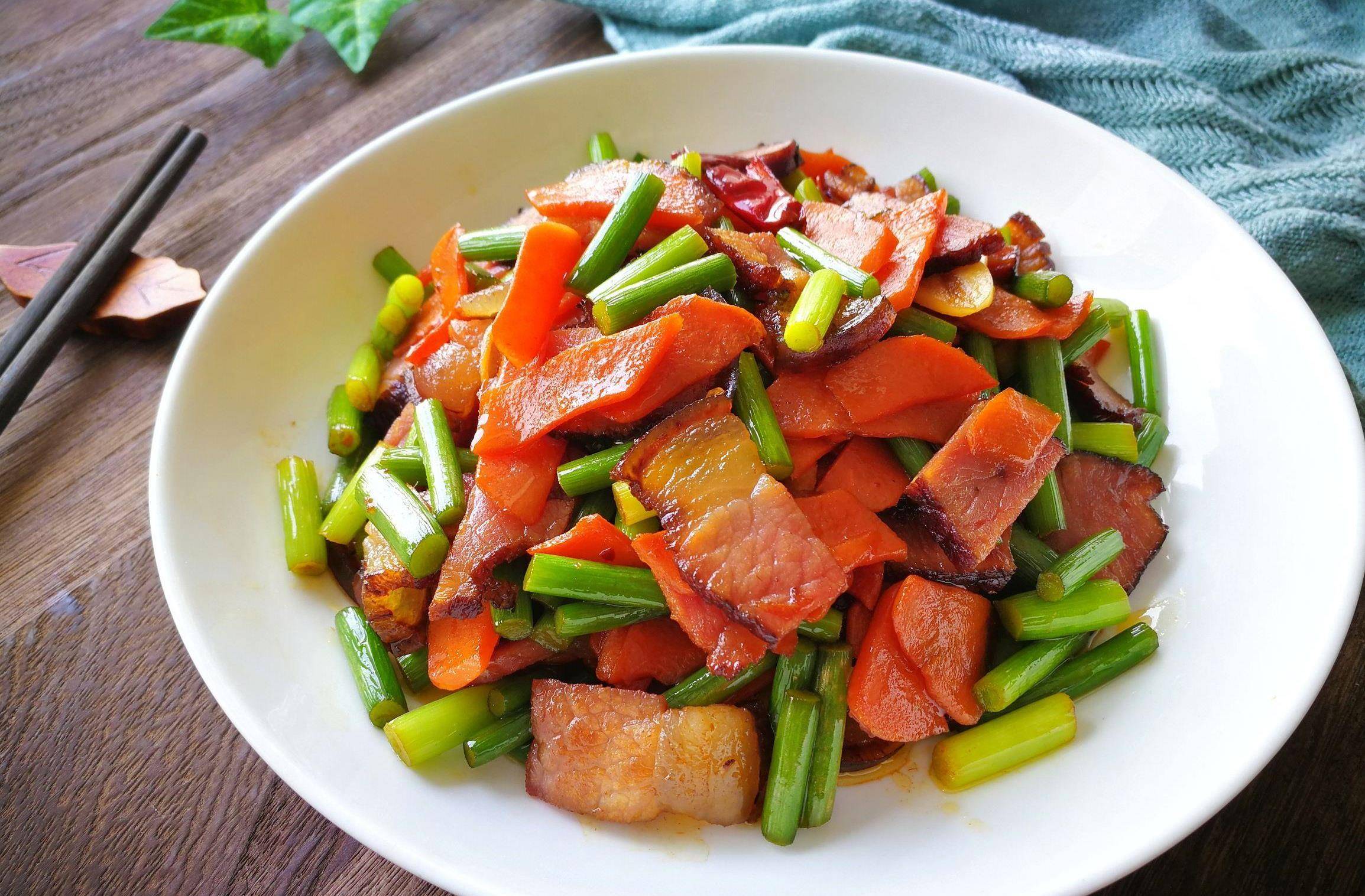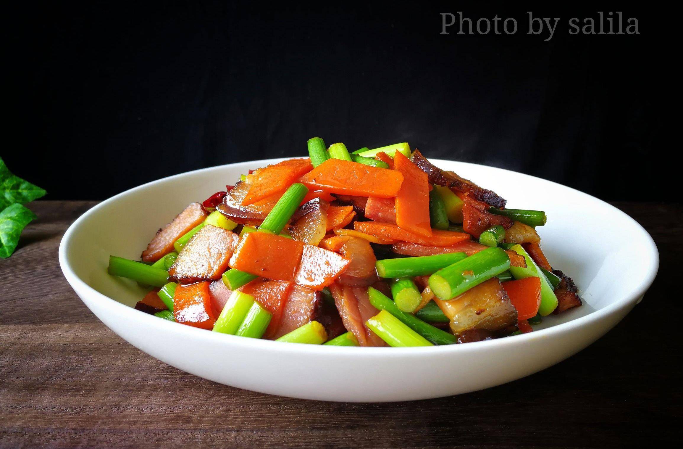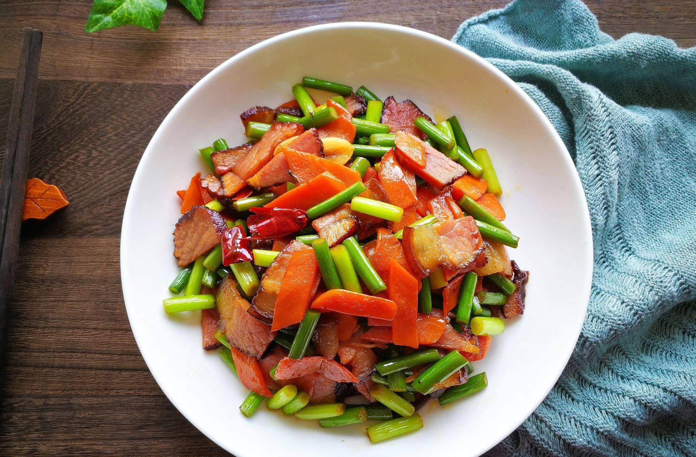 准备食材:腊肉一块,胡萝卜一根,蒜台一小把,干红辣椒两根,生姜两片,生抽一小勺