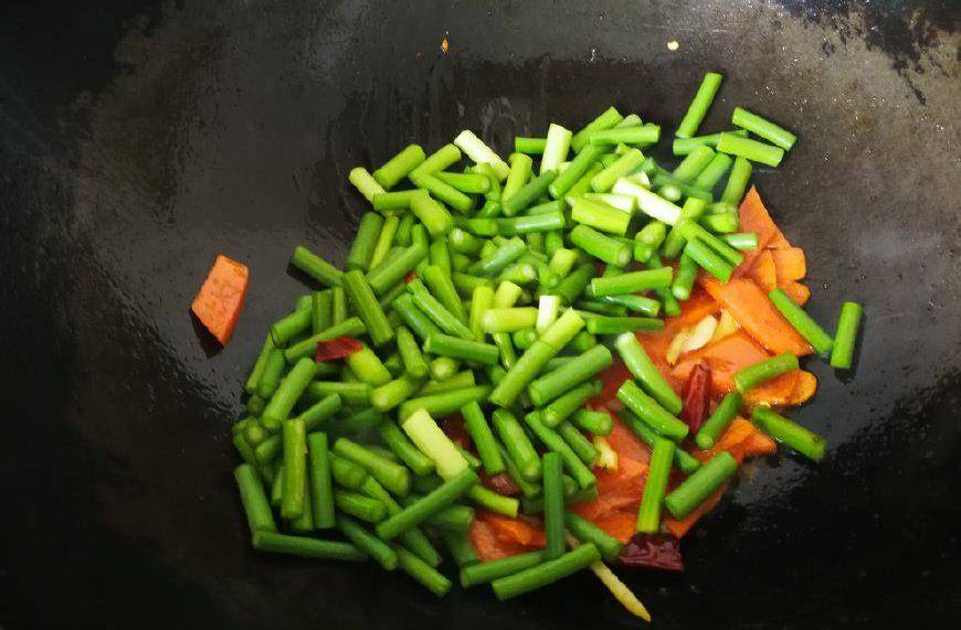 5、先放胡萝卜煸炒,胡萝卜变软后放入蒜台,中火翻炒。