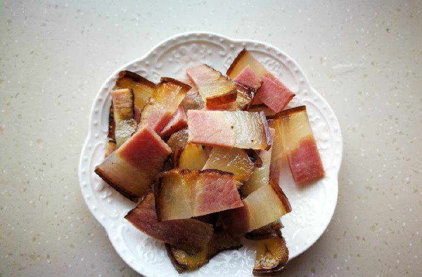 2、腊肉用淘米水清洗后用毛刷刷干净灰尘,再次用清水洗干净,放入锅中煮煮15分钟,捞出后切片。