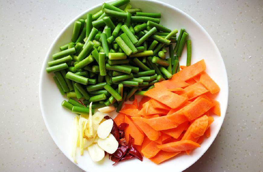 1、蒜台切段,胡萝卜切片,生姜切丝,大蒜切片,干红辣椒掰开后去籽。