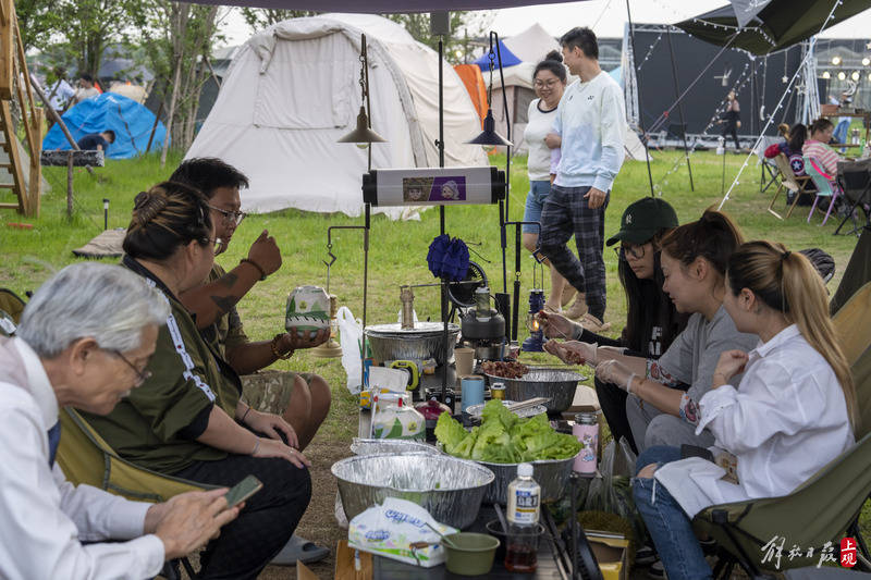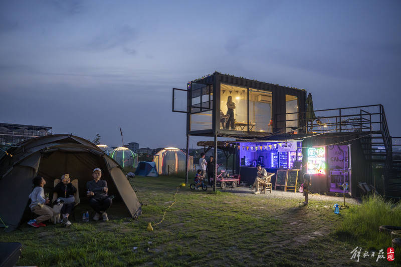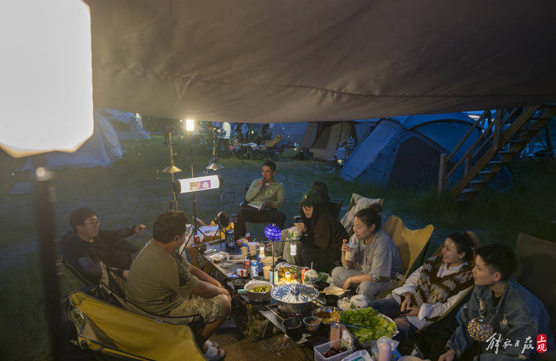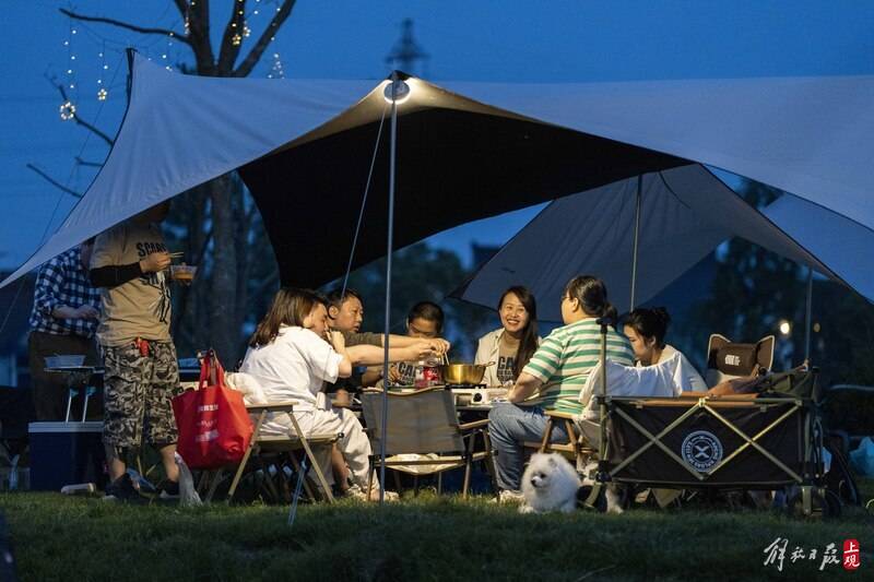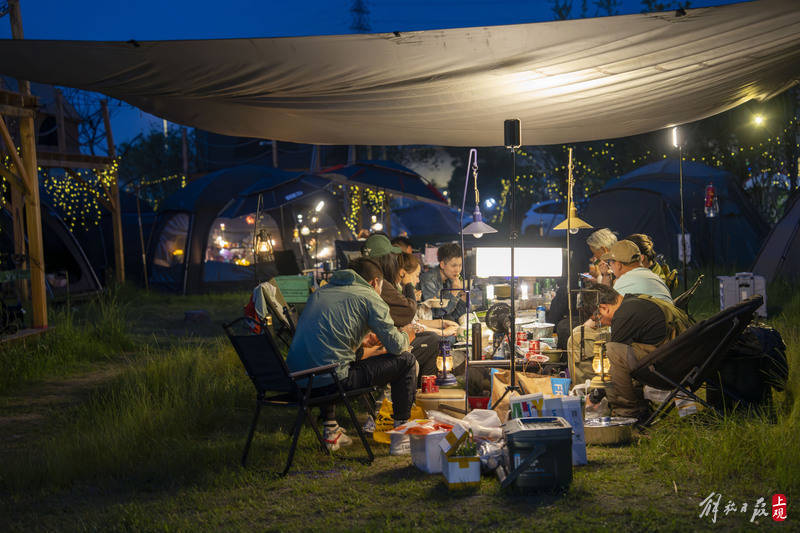 夜幕时分,帐篷、天幕上的串灯亮起,款式各异的露营灯也纷纷点亮,“露营村”进入了颜值最高的时刻。