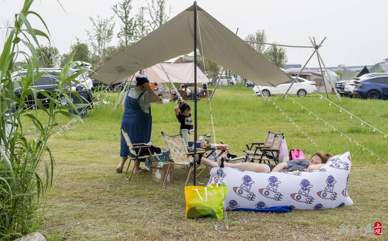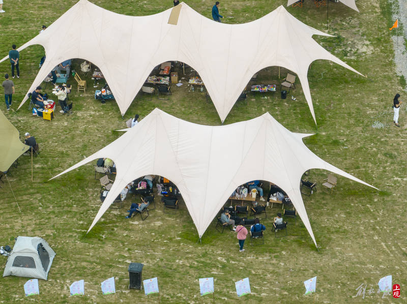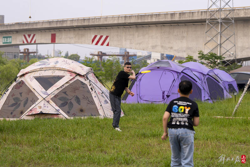 露营村内针对这些市民最关注的问题也提供了相应解决措施,大型天幕风绳上的布料几乎一直延伸到地面,十分醒目。该营地负责人樊晨告诉记者,来这边游玩的有不少都是初次到访的游客,亲子游客尤其多。“考虑到安全因素,营地内的公共天幕的风绳基本都非常醒目。到了晚上,风绳上还会挂亮起的串灯,一眼就能避开。”