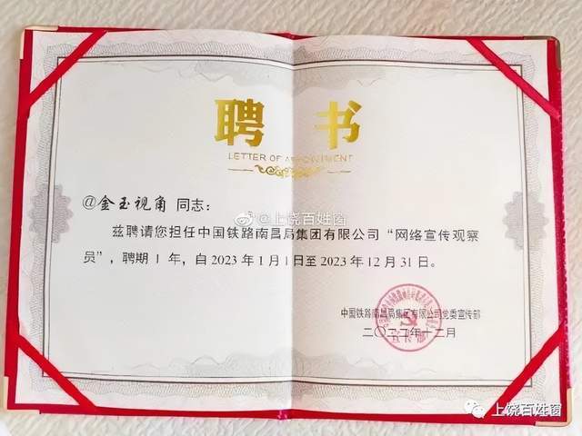 今年初,中国铁路南昌局集团有限公司聘请金玉为“网络宣传观察员”。(来源:上饶百姓窗 辛闻言)